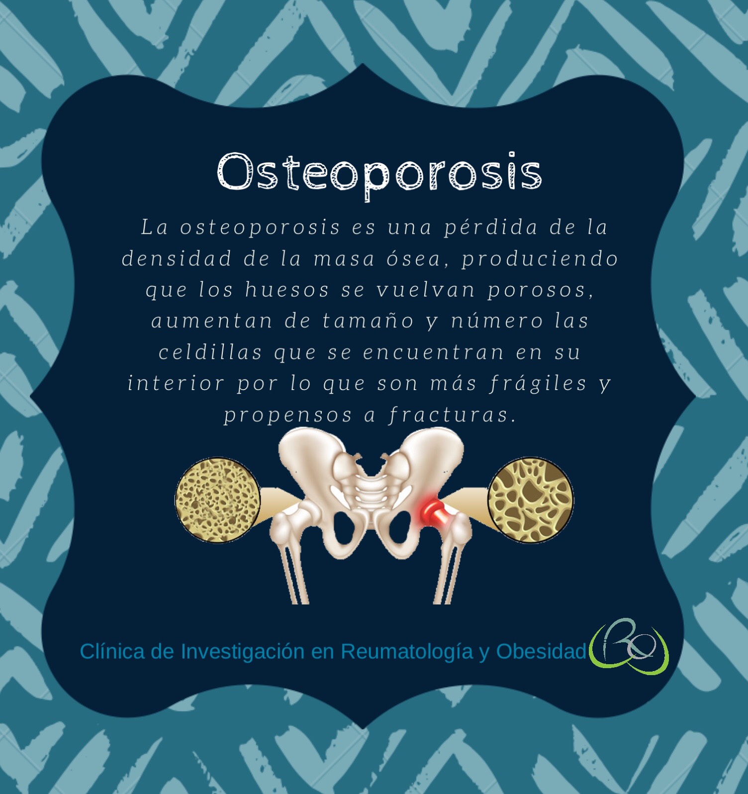 La osteoporosis es una pérdida de la densidad de la masa ósea, produciendo que los huesos se vuelvan porosos, aumentan de tamaño y falta de número las celdillas que se encuentran en su interior por lo que son más frágiles y propensos a fracturas.